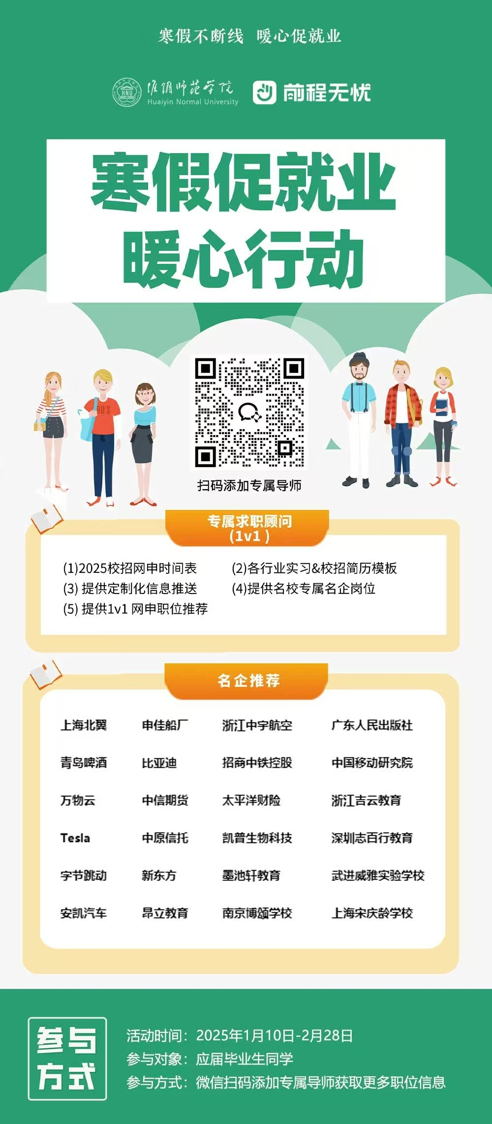 为贯彻落实党中央、国务院关于做好高校毕业生就业工作的决策部署,充分利用寒假窗口期,促进毕业生高质量就业,我校联合前程无忧举办“寒假促就业暖心行动”系列公益活动。