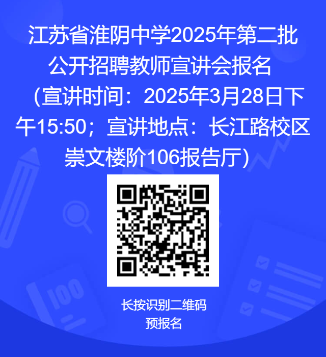 (1)利用微信扫描下方二维码,跳转至2025年江苏省淮阴中学第二批公开招聘教师报名页面,按要求填写相关信息并上传相关附件。