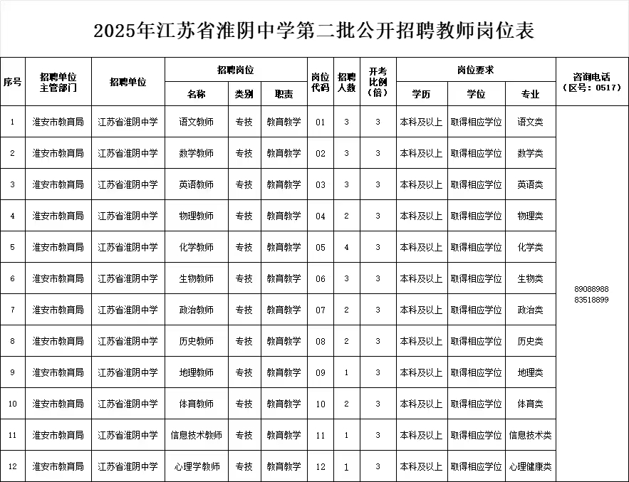 具体招聘要求和内容请见淮安市人社局网站或江苏省淮阴中学网站。
