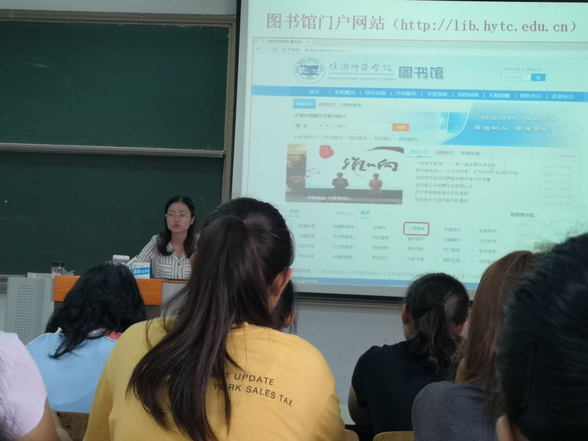 吴凡首先介绍了图书馆及其门户网站的概况,让新生对图书馆现状有了基本的了解,并就淮师图书馆网站上服务系统如馆内漫游、移动图书馆、我的图书馆等操作在大屏幕上展示了具体步骤。告诫新生要文明借阅,不仅要做有学识的大学生,更要做有修养的大学生。