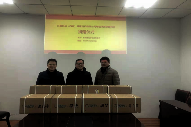 2021年12月22日上午,仟草优品(西安)健康科技有限公司向星空体育平台官网入口星空体育官网登录捐赠“丹吸”(速立神480盒、感快480盒、鼻立爽480盒、甜梦480盒)系列产品,共计157920.00元,用于师生健康防护。”星空体育官网登录副院长蔺新茂对仟草优品(西安)健康科技有限公司领导及全体员工的深情厚意表示感谢,同时表达要用好管好这批药品。