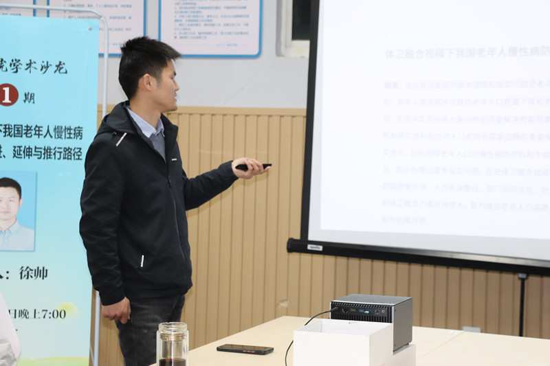 徐帅围绕“体卫融合视阈下我国慢性病防控机制”进行主题汇报,包括研究选题的基本思路、框架设计,以及目前研究存在的困惑和主要问题等。各位教师在认真听取汇报的基础上,从论文选题的逻辑,研究内容的深度、广度,结论的合理性与科学性等方面展开了深入讨论。