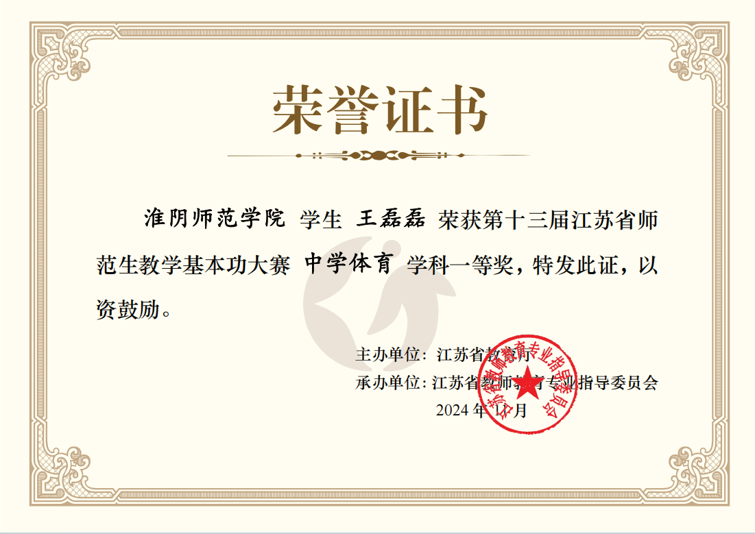近日,江苏省第十三届师范生教学基本功大赛获奖名单公布,体育教育专业2101 班王磊磊同学凭借出色表现,在艺体组比赛中脱颖而出,斩获一等奖殊荣。这一佳绩不仅是王磊磊同学个人的荣耀,更是学院师生共同努力的结晶。